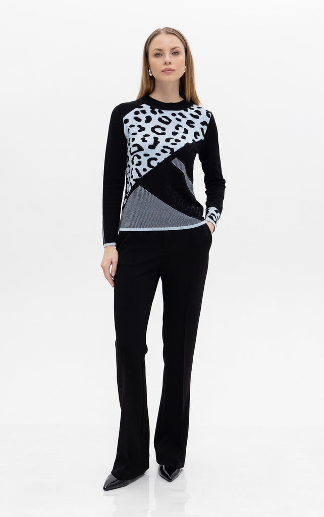 Das Oberteil von Passioni besticht durch grafische Flächen und Leo-Muster mit diagonalem Verlauf für eine moderne, figurschmeichelnde Optik sowie kontrastierende Farben und Strass-Elemente für einen lebendigen Look.