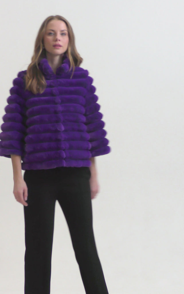 Diese Felljacke beeindruckt mit ihrer auffälligen Gestaltung und dem modernen Schnitt.