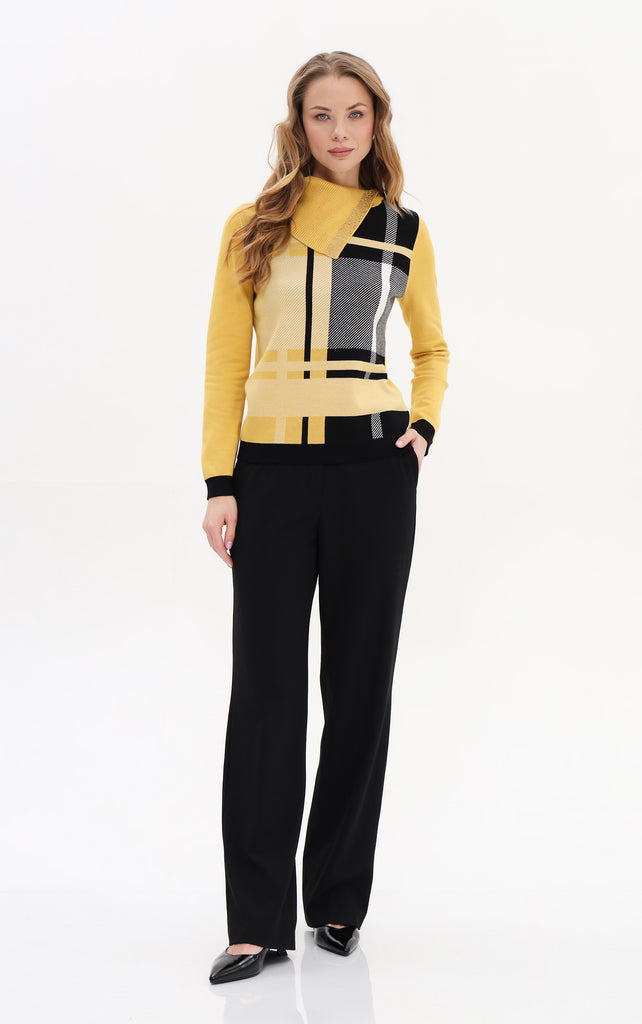 Dieser Pullover von Passioni setzt mit seinem asymmetrischen Kragen und dem grafischen Karomuster ein modisches Highlight.